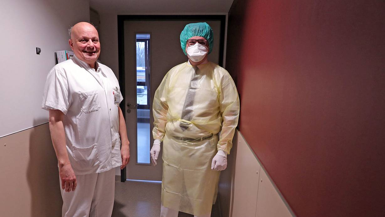 Johannes Balzer, Leiter der Krankenhaus-Hygiene, und Chefarzt Thorsten Pohle zeigen die Schutzkleidung, die in der Schleuse eines Isolierzimmers angezogen wird. | © Frank-Michael Kiel-Steinkamp
