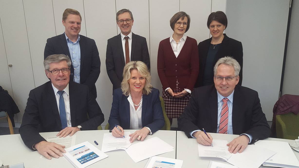 Kreis Herford. Der Schock saß tief, als im Mai des Vorjahres die Geburtenstation des Klinikums Herford schloss, weil Hebammen fehlen. Landrat Jürgen Müller reagierte und suchte die Partnerschaft zur privaten Fachhochschule des Mittelstand (FHM). Die ermöglicht ab Beginn des neuen Studienjahres im Oktober 2020 eine akademische Hebammen-Ausbildung auf dem Gelände des Bildungscampus. Als eine Art Starthilfe finanziert der Kreis Herford zehn Hebammen die Ausbildung. Am Donnerstag, 13. Februar, wurde der Vertrag unterzeichnet.