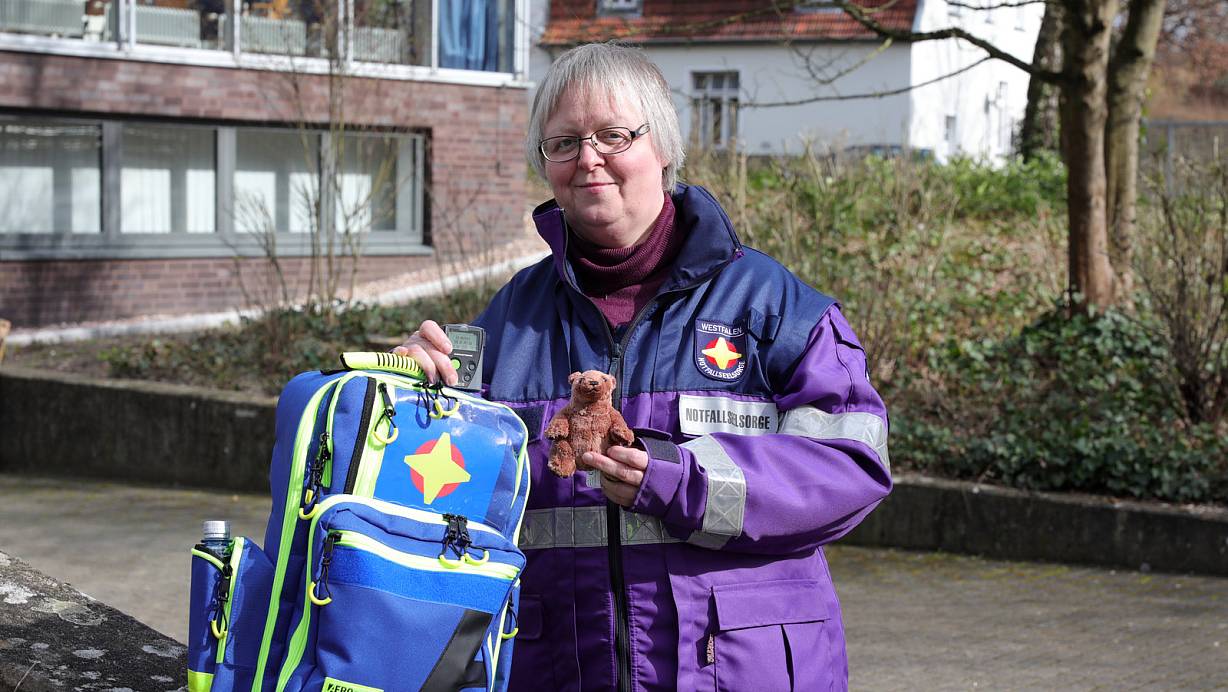 Notfallseelsorgerin und Pfarrerin Eva-Maria Schnarre freut sich über die Arbeitserleichterung durch ein neues Alarmierungssystem. Das Bärchen ist für Kinder. | © Frank-Michael Kiel-Steinkamp