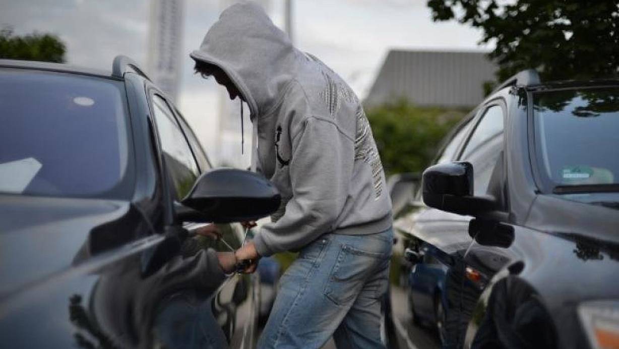 Ein Autodieb knackt einen Wagen (gestellte Szene). | © Polizei