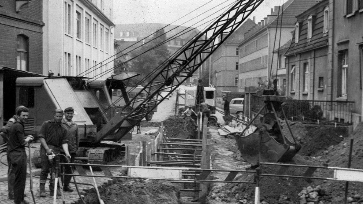 Aufmerksam schauen die Bauarbeiter in die Kamera des Fotografen. Die Bagger sehen anders aus als heute. | © Georg Heese (Kommunalarchiv)