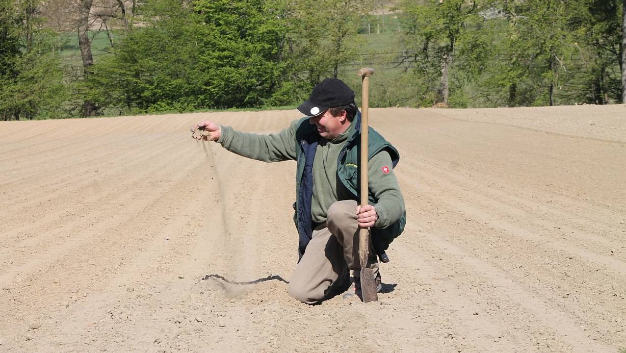 Landwirt Bernd Reinkensmeyer (52) kniet auf seinem trockenen Zwiebelfeld. | © Jobst Lüdeking
