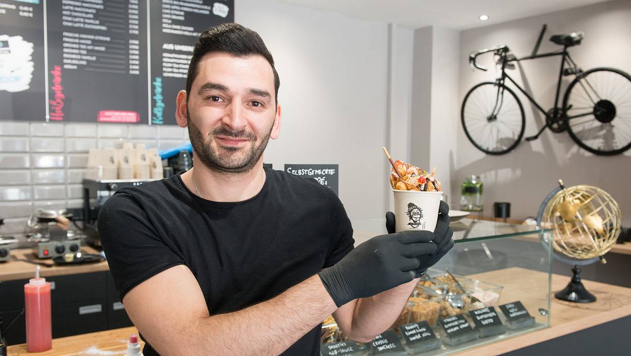 Gökay Celik, Inhaber der Yogurt-Bar Cheaty, zeigt eine seiner Bubble-Waffles, eine besonders lockere Waffelvariante mit Eis, Saucen und Toppings. | © Ralf Bittner