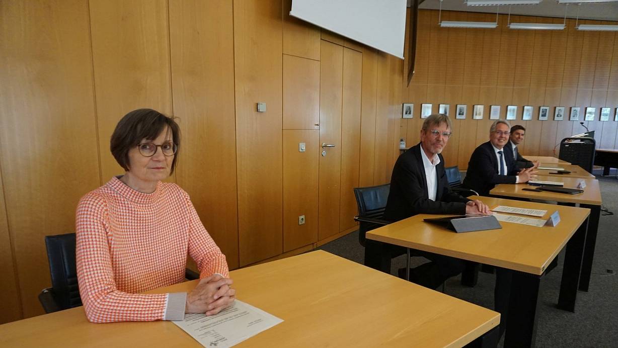 Pressekonferenz des Kreises Herford mit Abstand: (v.l.) Dr. Marie-Luise Kluger (Leiterin des Gesundheitsamtes), Norbert Burmann (Krisenstabsleiter), Land Jürgen Müller. Im Hintergrund: Kreisdirektor Markus Altenhöner. | © Christina Römer