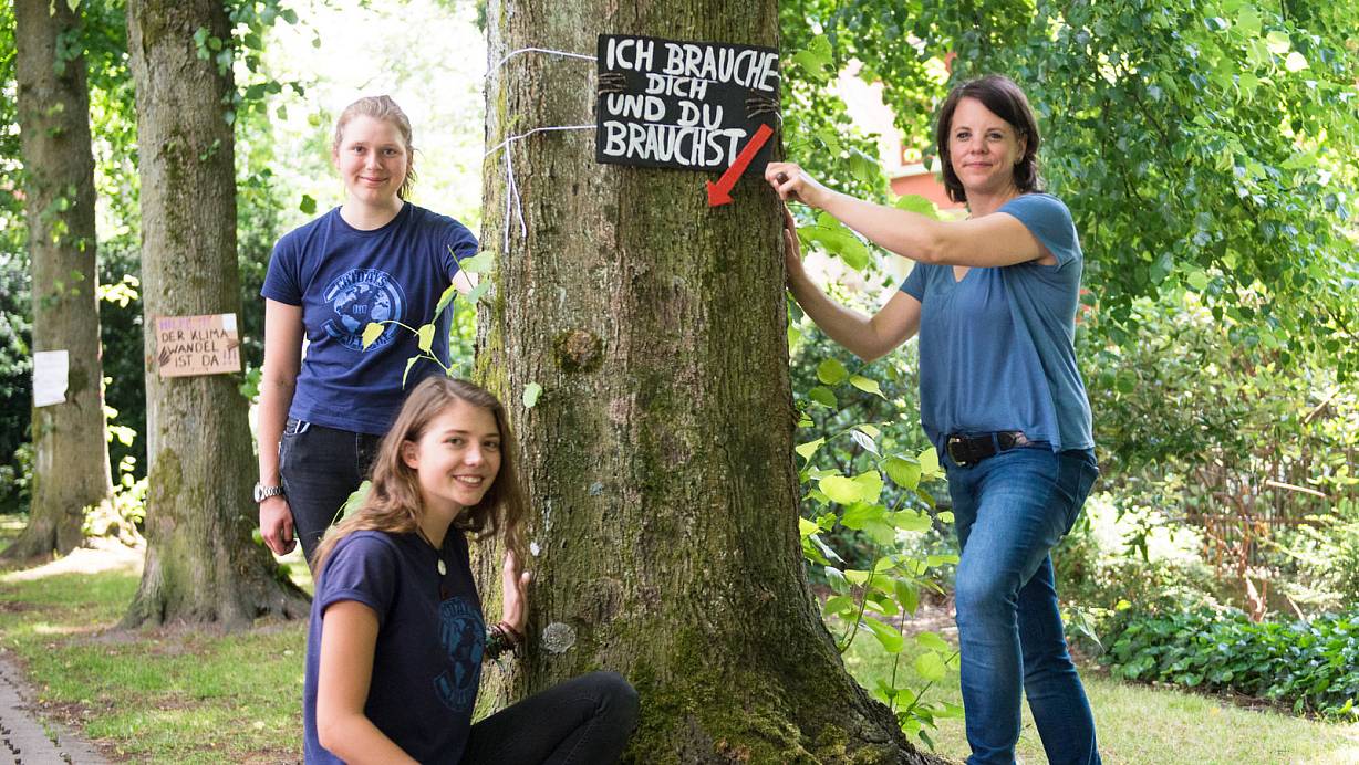 Julie Mettenbrink (v.l.), Phöbe Schröder von Fridays for Future und Svenja Winkler von Parents for Future unterstützen die Bäume bei ihrer "Baumdemo" auf dem Wall. | © Ralf Bittner