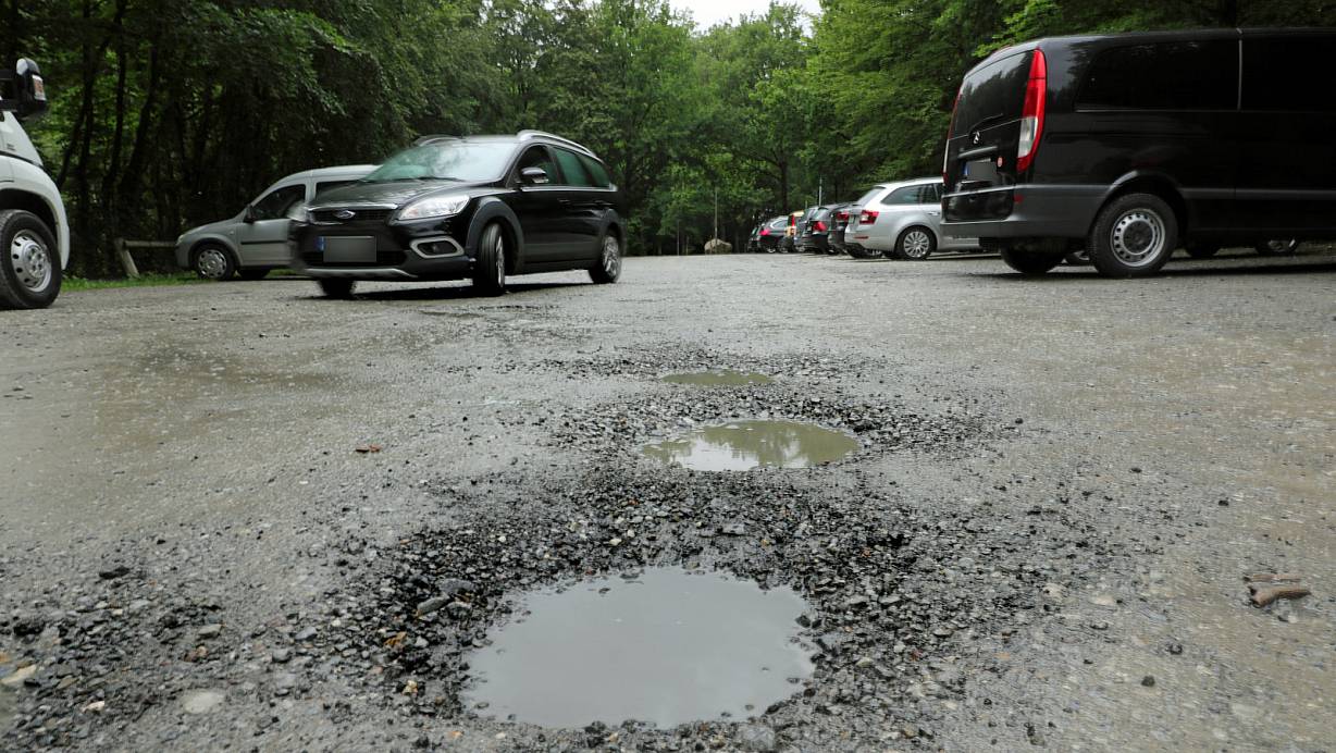 Der Parkplatz des Herforder Tierparks weist tiefe Schlaglöcher auf. Bei Regenwetter verdrecken Schuhe und Fahrzeuge schnell. | © Frank-Michael Kiel-Steinkamp