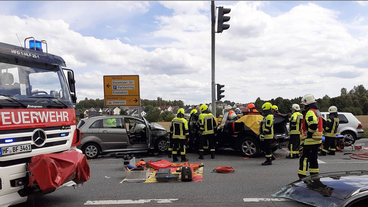 Fünf Menschen werden an der Kreuzung zur Ringstraße bei einem Zusammenstoß verletzt. Ein Mercedes-Fahrer aus Löhne gilt als Verursacher. Es kommt zu massiven Behinderungen.