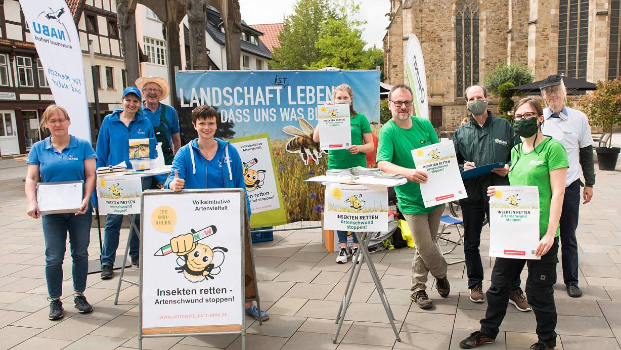 Mitglieder der Naturschutzverbände BUND und NABU sammeln gemeinsam Unterschriften für die Volksinitiative Artenvielfalt, die die Insekten retten und den Artenschwund stoppen möchte. | © Ralf Bittner
