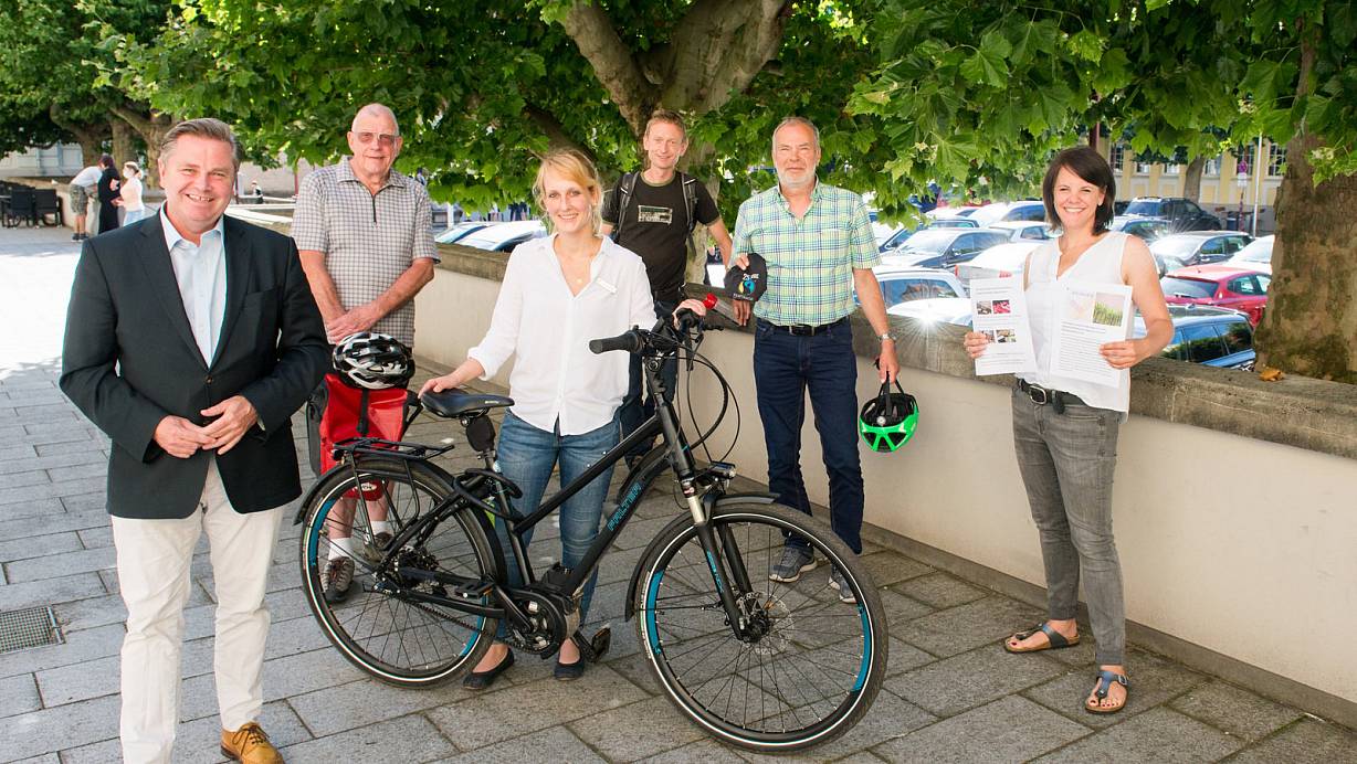 Die Klimaschutzbeauftragte Laetitia Müller (3. v.l) freut sich mit Bürgermeister Tim Kähler (l.), dass sich viele Akteure an der Klimaschutzwoche beteiligen. Dabei sind Peter Gülpe vom ADFC (hi. v. l.), Ralf König (Grünflächenamt), Manfred Mohning (Fairtrade-Gruppe) und Svenja Winkler von den Parents for Future sowie die Recyclingbörse und der BUND. | © Ralf Bittner
