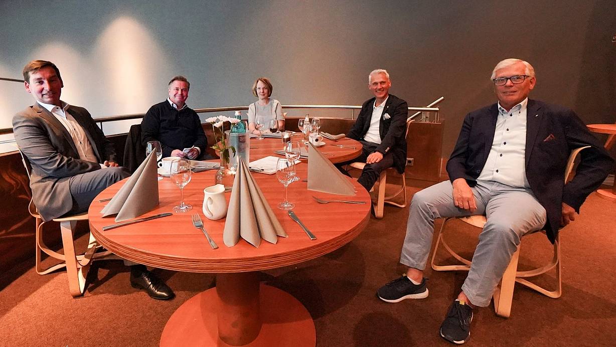 Der Vorsitzende der NRW-SPD Sebastian Hartmann (MdB, v.l.), Bürgermeister Tim Kähler, Stella Ahlers (Ahlers), Marc Freyberg (Brax) und Wolfgang Brinkmann (Bugatti) im Austausch. Foto: SPD | © SPD