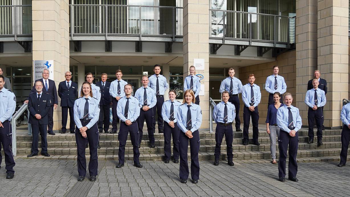 Kreis Herford. Die meisten von ihnen sind junge Absolventen der Hochschule für Polizei und öffentliche Verwaltung des Landes NRW. Zwei der jetzt am Herforder Kreishaus vorgestellten neuen Beamten der Kreispolizeibehörde Herford waren bereits für die Polizei im Einsatz und haben sich in ihren Heimatkreis und zu ihrem Wohnort versetzen lassen. Insgesamt 19 neue Polizisten – sechs Frauen und 13 Männer, haben jetzt als „Nachersatz“ ihren Dienst im Wittekindkreis angetreten.