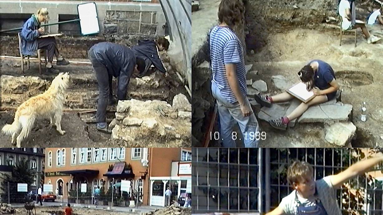 Filmmaterial von der damaligen Ausgrabung am Münster wurde in das Video zum Archäologischen Fenster eingebaut. Links oben Hund Schröder, rechts unten der blutjunge Ausgrabungsleiter Matthias Wemhoff. | © Geschichtsverein