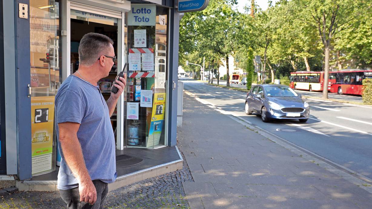 Kein Passant sondern Polizist: Hauptkommissar Mario Hoffmann steht am Kiosk und nimmt Verkehrssünder ins Visier. | © Frank-Michael Kiel-Steinkamp