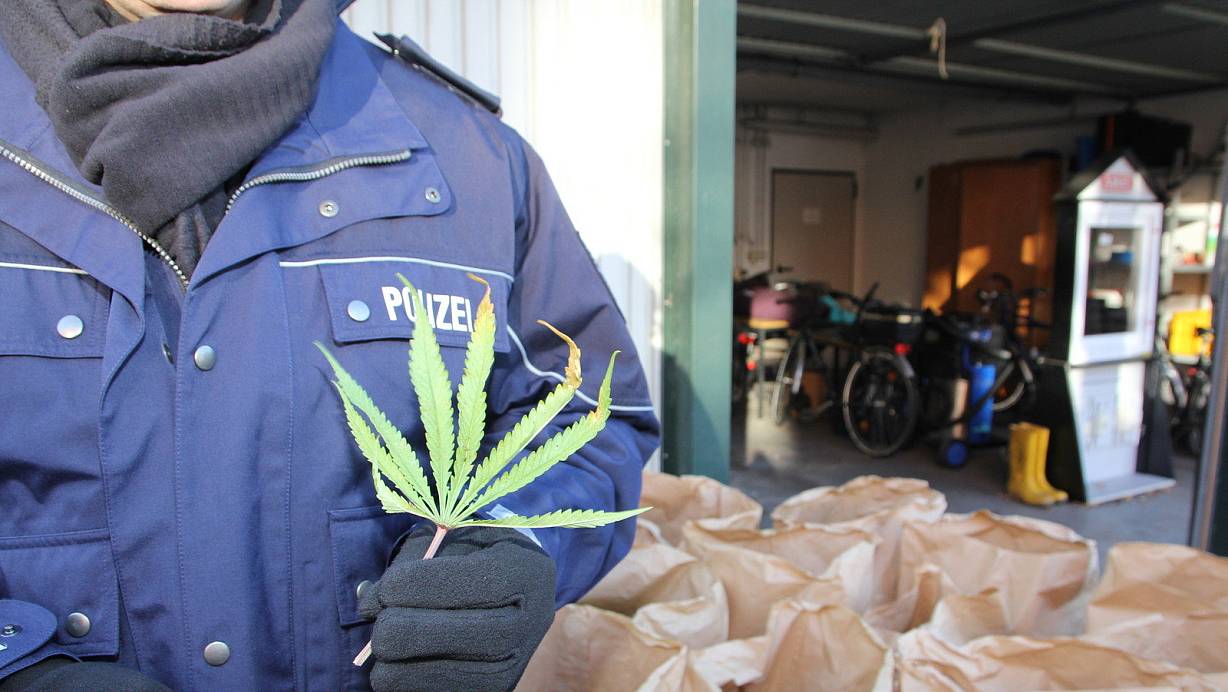 Ein Polizist hält ein Hanfblatt, das zu einer sichergestellten Pfalze gehört, in der Hand. | © Jobst Lüdeking