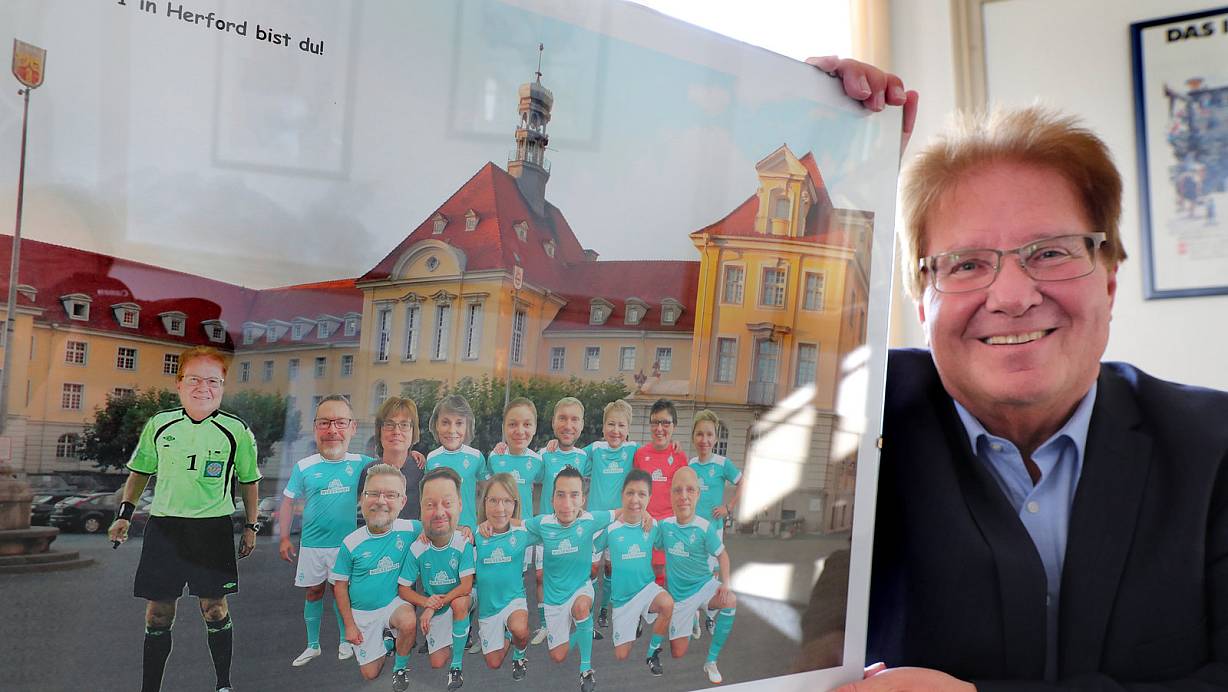 Als Schiedsrichter mit Fußballmannschaft hat das Team von der Abteilung Bürgerservice, Sicherheit und Ordnung seinen Chef Lothar Sobek in einer Fotomontage vor das Rathaus gestellt. | © Frank-Michael Kiel-Steinkamp