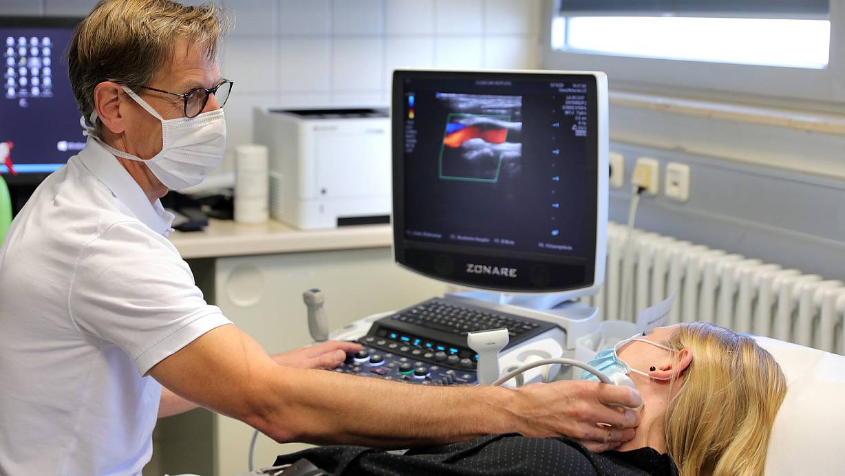 Chefarzt Kristian Nitschmann kontrolliert (in einem hier gestellten Foto) mit einem Ultraschallgerät die Halsschlagader einer Patientin. | © Frank-Michael Kiel-Steinkamp