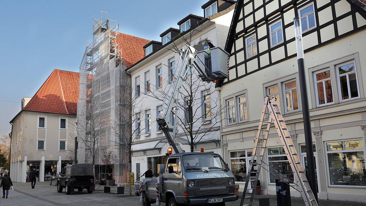 Mitarbeiter des Schaustellerbetriebes Küchenmeister haben damit begonnen, Lichterketten in die Bäume am Neuen Markt zu hängen. | © Frank-Michael Kiel-Steinkamp