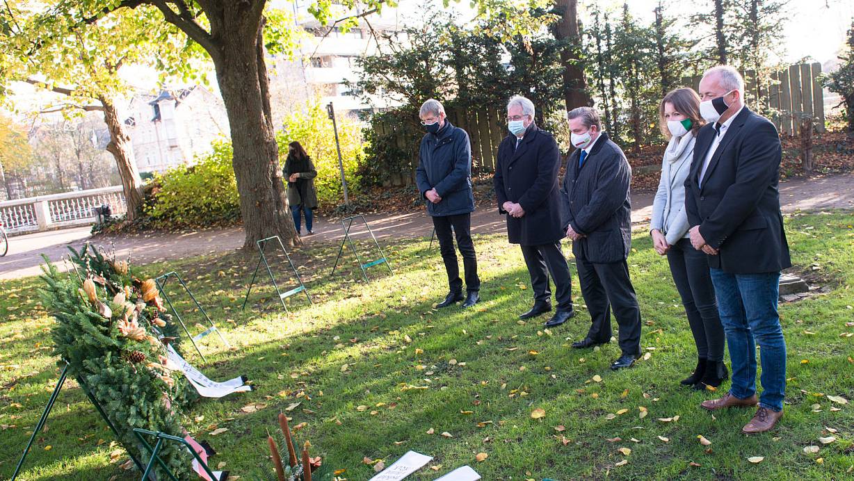 Kreisdezernent Norbert Burmann (v. l.), Landrat Jürgen Müller, Bürgermeister Tim Kähler sowie Sylvia Czentarra-Thies und Uwe Thies als Vertreter der Schützengesellschaft zu Herford von 1832 legen am Volkstrauertag Kränze am Mahnmal am Bergertor nieder. | © Ralf Bittner