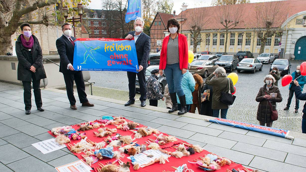 Mit der Aktion „Flagge zeigen“ vor dem Rathaus weisen Gleichstellungsbeauftragte, Frauenorganisationen auf den internationalen Gedenktag gegen Gewalt an Frauen hin. Ein Thema ist der Femizid.