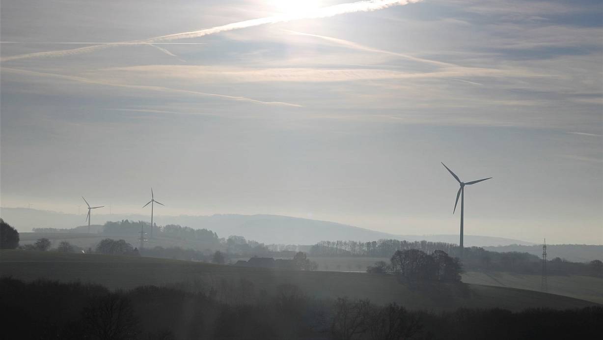 Im Gegenlicht in Richtung Südosten wird der Dunstschleier sichtbar, der an diesem Morgen noch über den Hügeln und Feldern liegt. Zahlreiche Windräder ragen aus dieser typisch ostwestfälischen Landschaft heraus. | © Meiko Haselhorst
