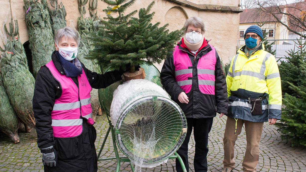 Pfarrerin Annette Beer, Pfarrer Johannes Beer und Presbyter Herbert Busch-Prüßing, einer der Ehrenamtlichen, die sich beim Verkauf engagieren, bieten Weihnachtsbäume für den guten Zweck an. | © Ralf Bittner