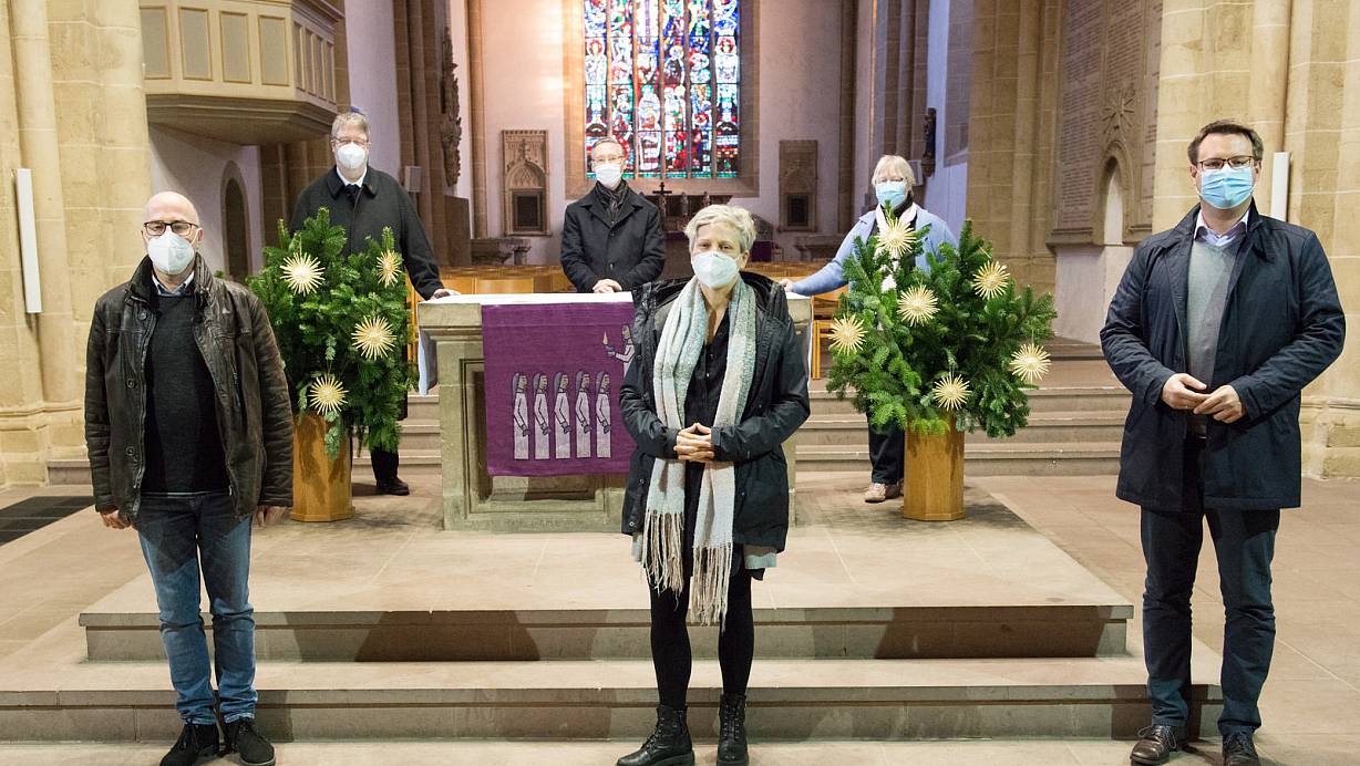 Die Pfarrer Dietmar Stuke (Laar, v. l.), Johannes Beer (Mitte), Gerald Haringhaus (Pastoraler Raum Wittekindsland, katholische Kirche), Frauke Wagner (Stiftberg), Eva-Maria Schnarre (Emmaus) und Lars Schwesinger (Evangelisch Freikirchlich Gemeinde) stellen ihre Angebote für die kommenden Tage vor. | © Ralf Bittner