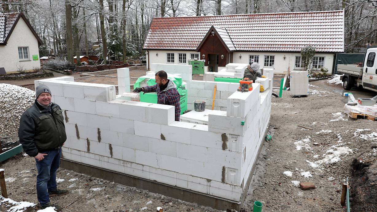 Das neue Kassenhäuschen mit Kiosk am Eingang zum Tierpark wächst heran. Tierparkchef Thorsten Dodt (links) freut sich, dass die Besucher in Zukunft zügiger eingelassen werden können. | © Frank-Michael Kiel-Steinkamp