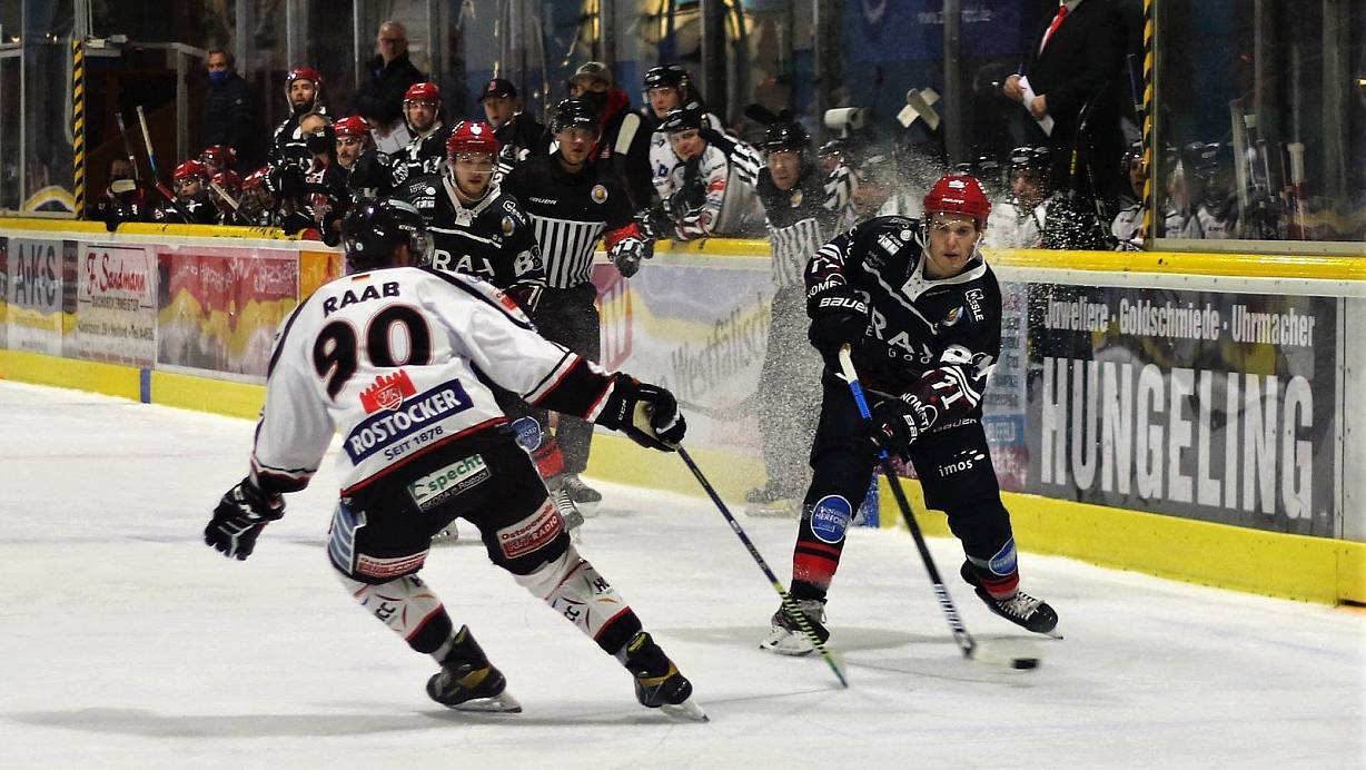 Matyas Kovács (rechts) traf für die Herforder Ice Dragons zum 1:2 und ließ die Gastgeber im umkämpften Westfalenderby wieder hoffen. | © Yvonne Gottschlich