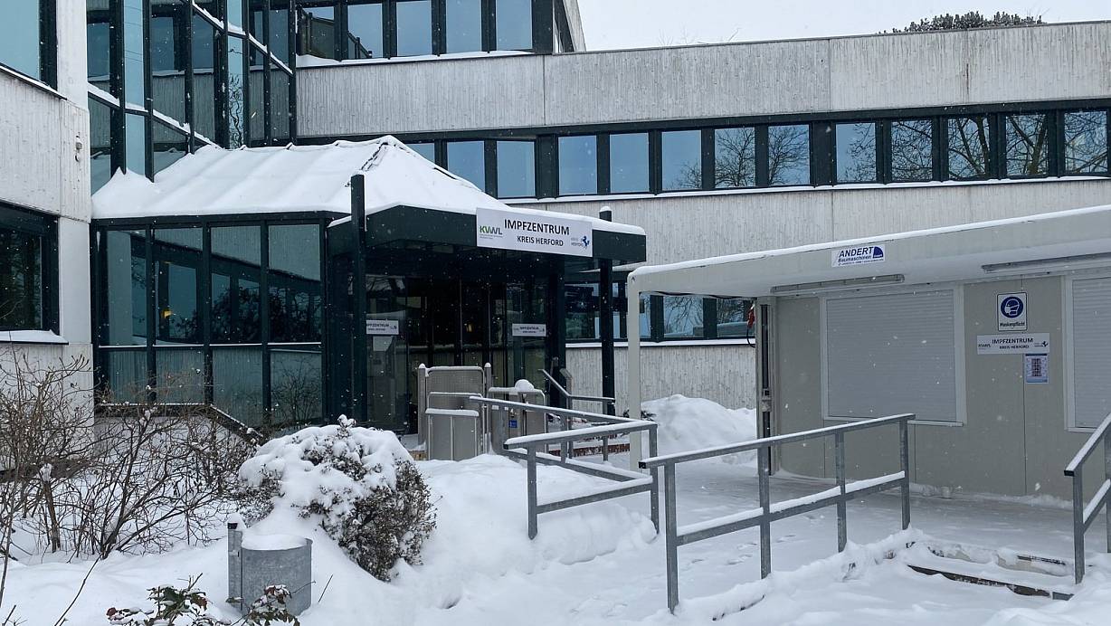 Winterlicher Start: Das Impfzentrum des Kreises war zum Impfstart weißgefärbt. Die extremen Wetterverhältnisse sorgten für einige Herausforderungen. | © Kreis Herford