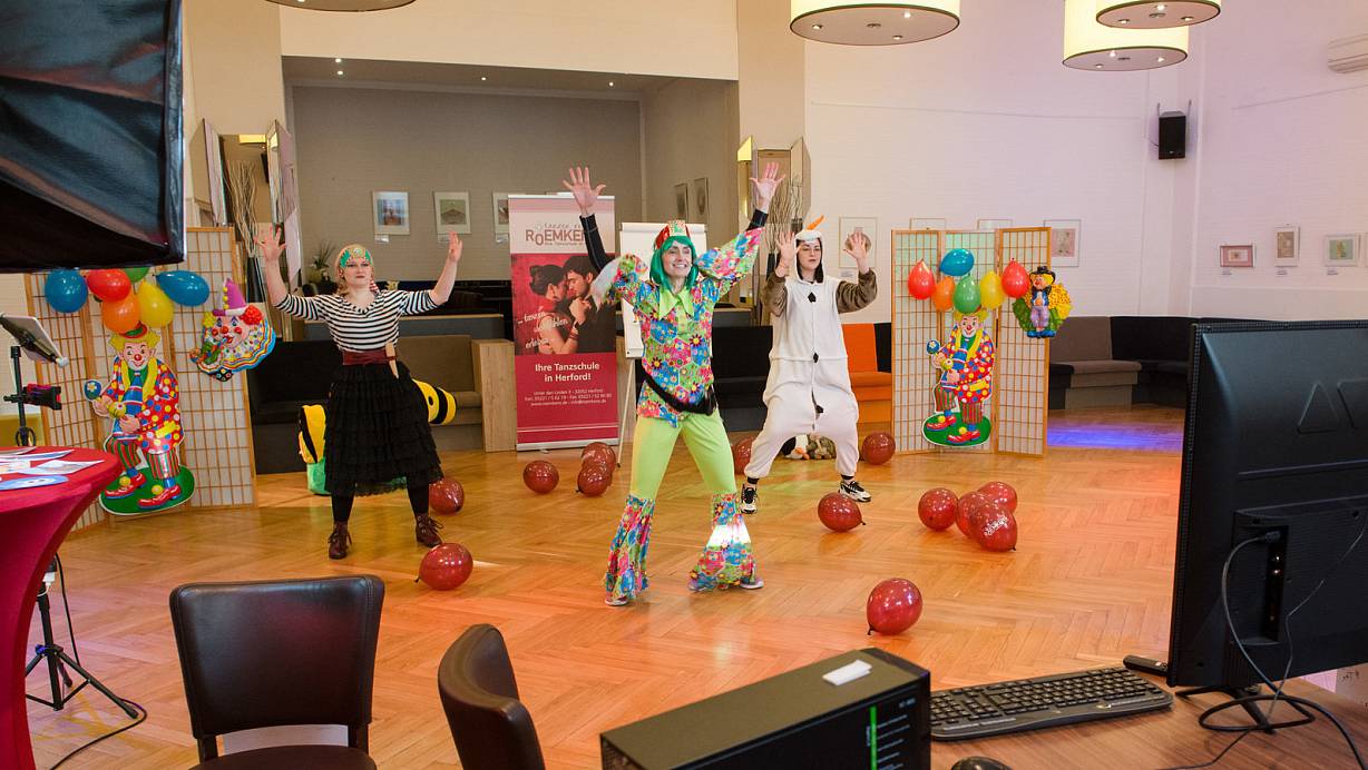 Die Tanzschule Roemkens hat eine Online-Karnevalsparty für die jungen Tanzschülerinnen orginsiert. Bettina Riedel und zwei ihrer Trainerinnen tanzen vor, die Tänzerinnen tanzen zuhause mit. | © Ralf Bittner