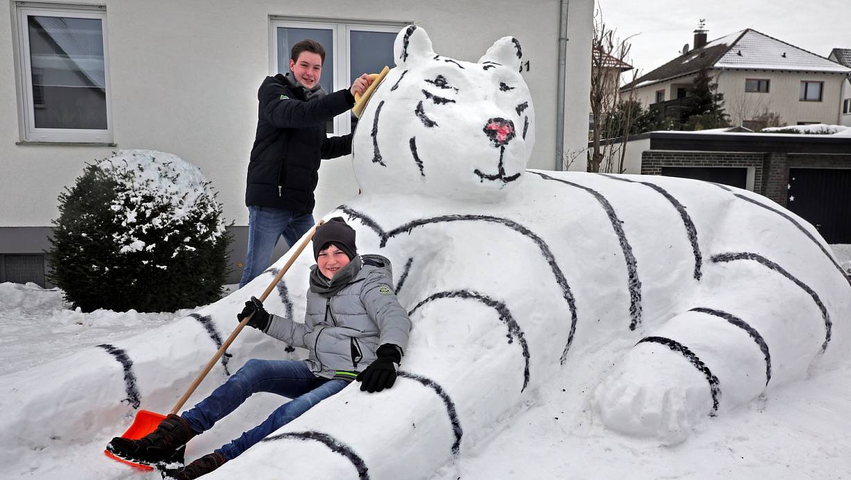 Fabian und Finn Sumfleth aus Schweicheln haben zusammen mit ihrem Vater Andreas im Vorgarten einen Sibirischen Tiger aus Schnee gebaut. | © Frank-Michael-Kiel-Steinkamp