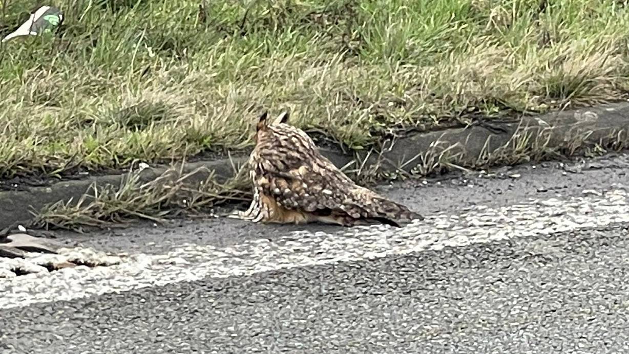 Das Tier sitzt lethargisch und bewegungslos auf der Autobahn fest. Lother Köhnemann konnte die Eule bergen und hat sie zum Tierpark Herford gebracht.