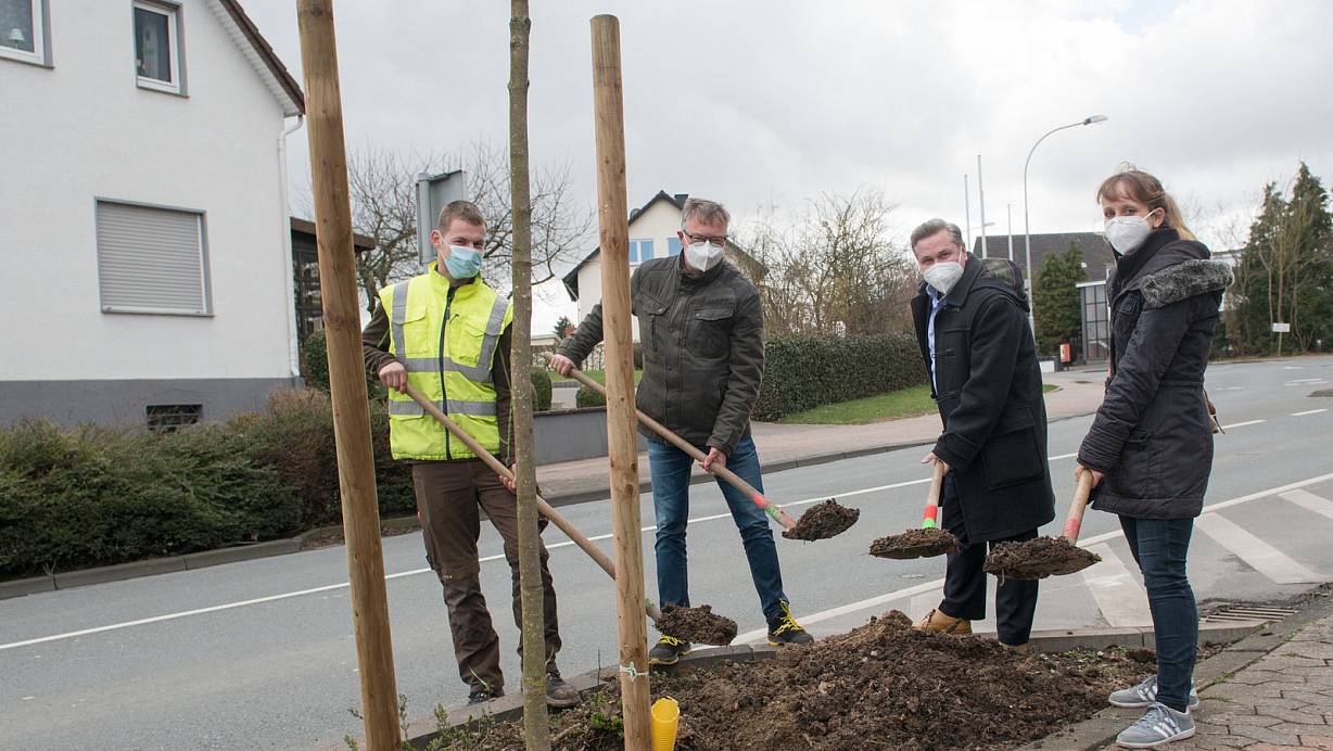 Florian Müller (SWK, v. l.), Axel Echternkamp (Grünflächenamt), Bürgermeister Tim Kähler und Klimaschutzmanagerin Laetitia Müller zeigen schon mal, wie das mir dem Einpflanzen funktiorniert. | © Ralf Bittner