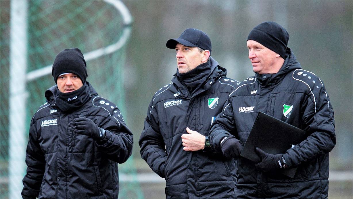 Nur noch zwei statt drei: Dennis Freund (l.) ist aus dem Trainerteam des SV Rödinghausen ausgeschieden, Cheftrainer Nils Drube (m.) hat mit Robert Roelofsen (r.) jetzt noch einen Assistenztrainer an seiner Seite. Foto: Noah Wedel | © Noah Wedel