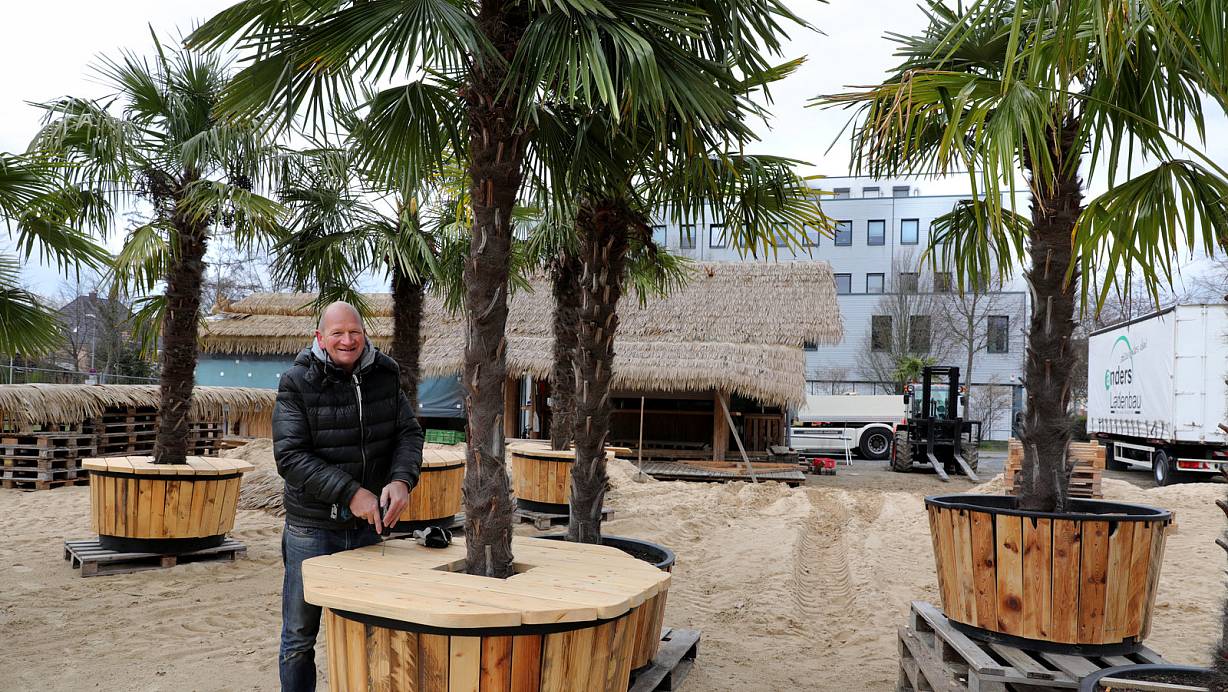 Frank Berghaus baut seinen Aloha-Beach-Club auf im Vertrauen darauf, dass er ihn im Mai eröffnen kann. | © Frank-Michael Kiel-Steinkamp