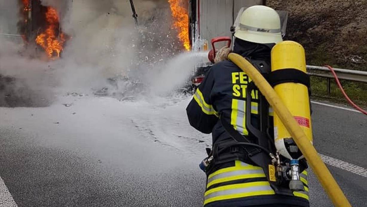 Löscharbeiten am Lkw: Das Fotos zeigt gut, wie die Akku-Teile explodieren. Die kleinen schwarzen Punkte sind offenbar Teile der E-Bikes, die weggeschleudert werden. | © Feuerwehr Vlotho