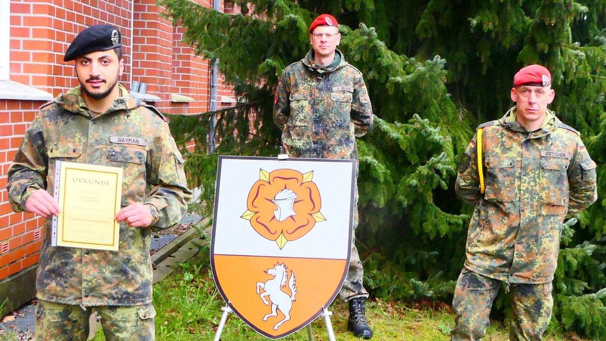 Kompaniechef André Frank und Kompaniefeldwebel Marco Böttcher (im Hintergrund) gratulieren dem Unfallhelfer zu seinem mutigen Handeln. Fran hat dem Herforder für sein beherztes Eingreifen beim Motorradhelfer eine "förmliche Anerkennung" erteilt. | © Bundeswehr/ Jens Wander