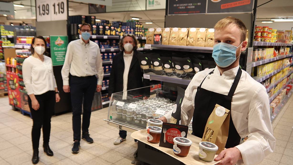 Schausteller Björn Laffontien stellt mit Koch Jan Haude selbstgemachte Produkte aus der Markthalle im Marktkauf Herford vor. Die Stand läuft zwei Monate und lockt mit einer Rabattaktion.