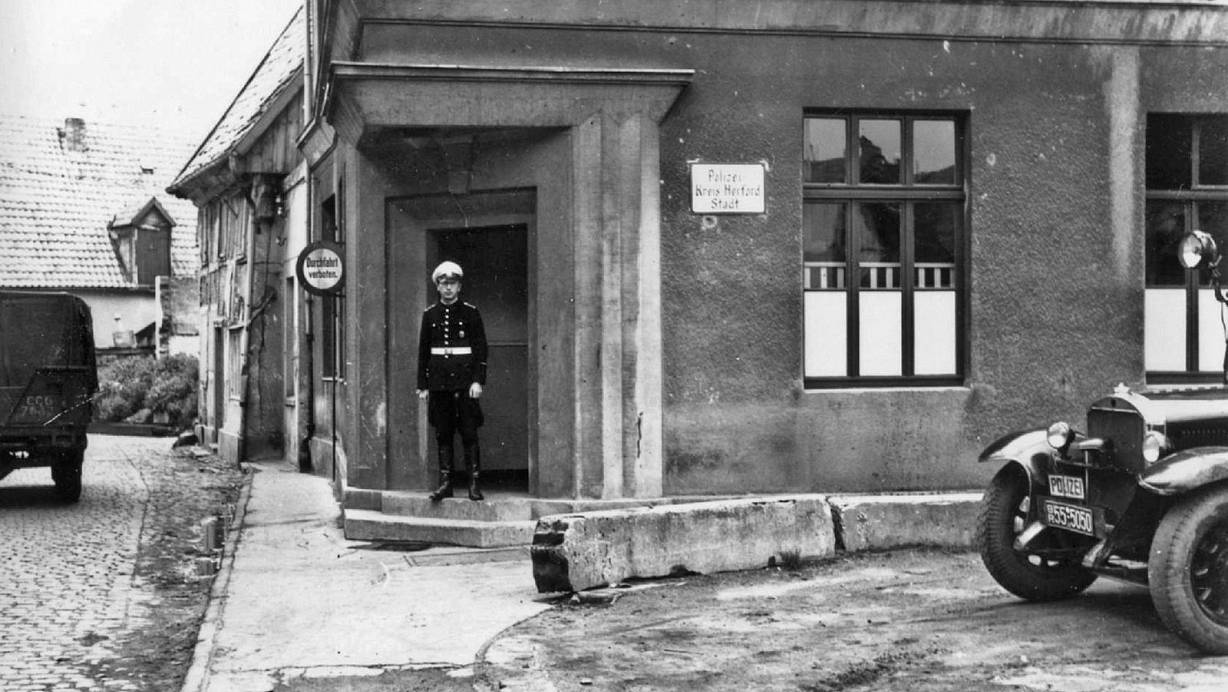 Der Polizist trug Hosen, wie sie zur Offiziersuniform der Wehrmacht gehört hatten. | © Sammlung Jürgen Czopp (Kommunalarchiv)
