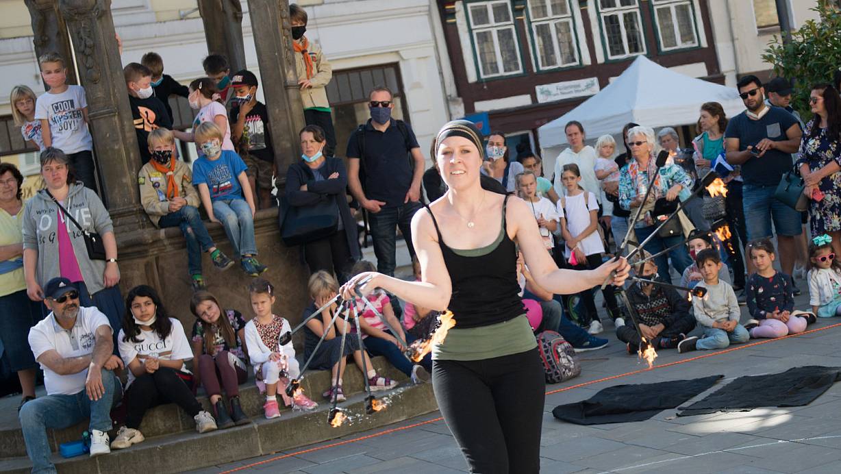 Michelle von der Feuer-Jonglage-Gruppe "Feuerflut" zieht beim 20. Weltindertag 2020 die Besucher in in ihren Bann. | © Ralf Bittner