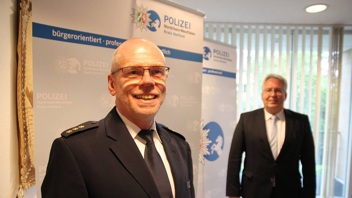 Uwe Köhler (als Nachfolger von Polizeidirektor Dirk Zühlke) tritt seine neue Funktion als Abteilungsleiter bei der Kreispolizeibehörde Herford an. Im Hintergrund Landrat Jürgen Müller. | © Susanne Barth