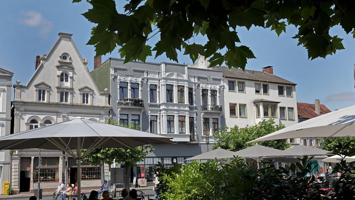 An der Häuserzeile am westlichen Rand des Alten Marktes sticht das aufwendig sanierte WMF-Haus mit seiner historuschen Fassade hervor. | © Frank-Michael Kiel-Steinkamp