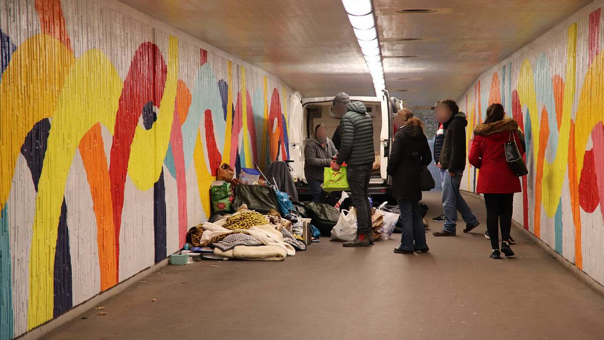 Der Obdachlose "Lobo" und sein Hund Kampfkrümel müssen im Dezember 2020 ihr kleines Lager in der Unterführung zum Bahnhof räumen. | © Alexandra Golfinger