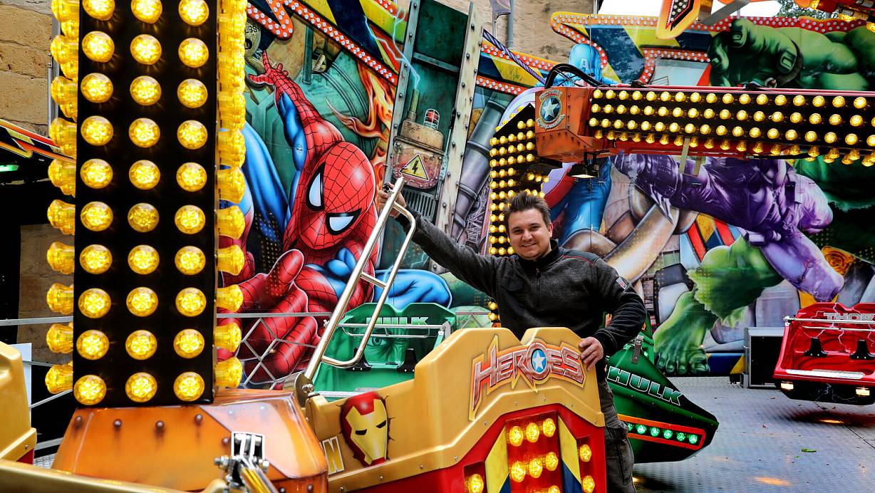 Schausteller Marvin Fick aus Nienburg bringt sein Fahrgeschäft „Heroes“ nach dem Einsatz in Löhne nun an der Münsterkirche wieder auf Hochglanz. | © Frank-Michael Kiel-Steinkamp