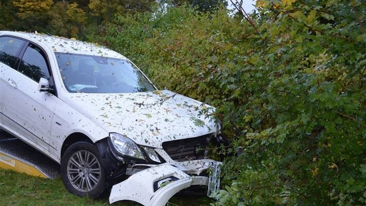 11.000 Euro Schaden: Mercedes flutscht von der nassen Fahrbahn und stoppt vor einem Baum.