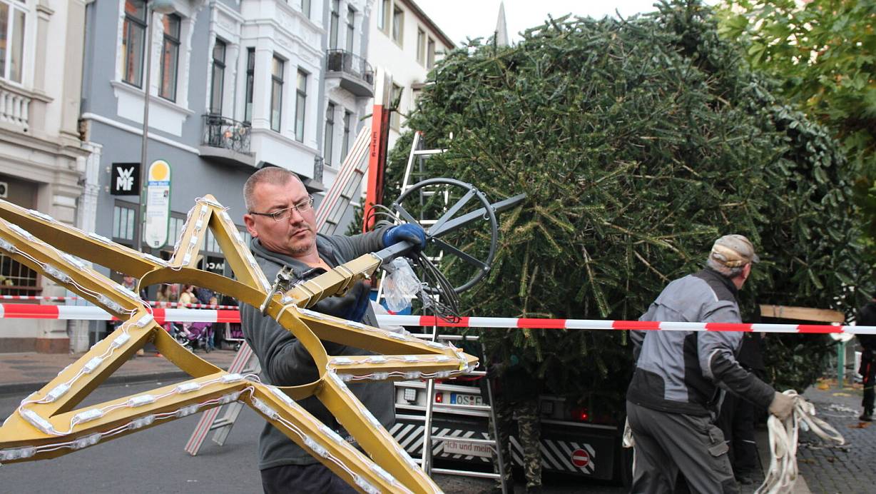 Eine etwa 20 Meter hohe Nordmanntanne bildet das Herzstück des Weihnachtslichtes. Etliche Schaulustige haben am Sonntag das routinierte Arbeiten des Laffontien-Teams neugierig verfolgt.