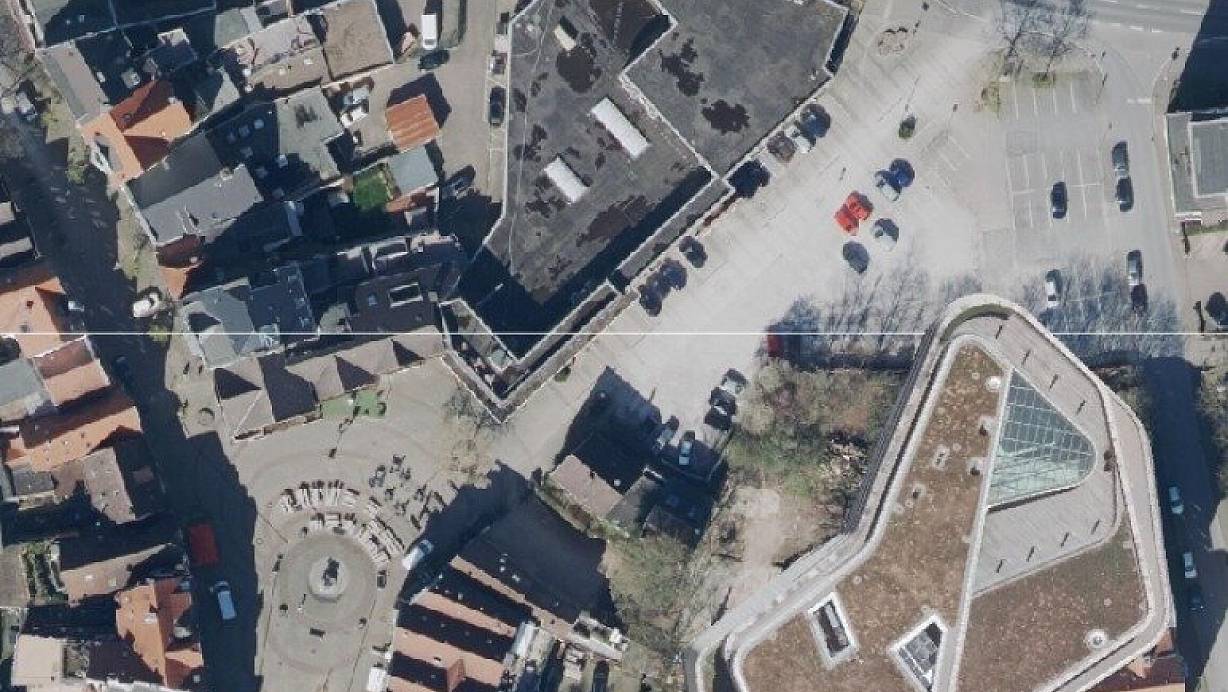 Die Verwaltung hat das Montforthaus in der entsprechenden Größe auf die städtische Zaky-Fläche gelegt. Rechts liegt es über dem Carl-Severing-Haus und dem nebenstehenden ehemaligen Hotelgebäude. In der Ecke unten rechts ist das Eckhaus Löhrstraße/Kirchgasse zu sehen. Oben rechts befindet sich der Janup-Parkplatz, oben das Expert-Döring-Gebäude, links der Gänsemarkt. | © Stadt Herford