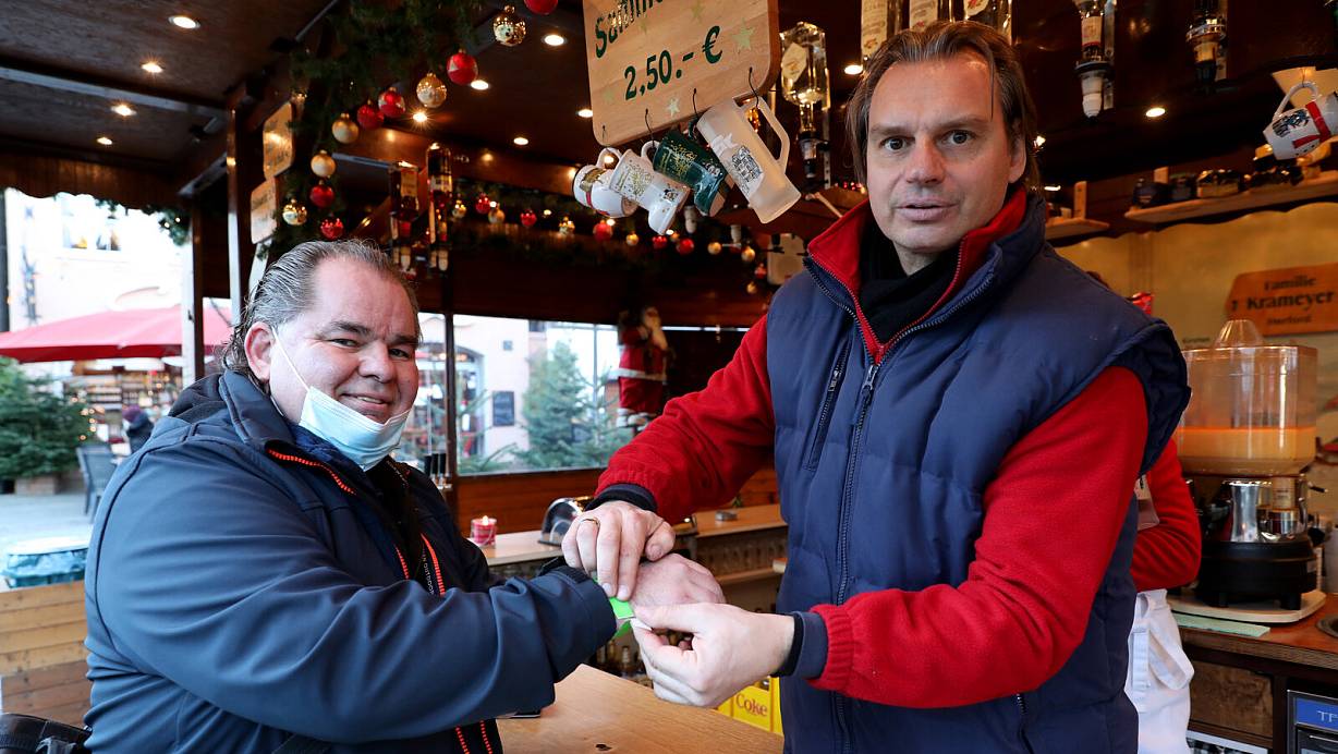 Kunde Jürgen Feyerabend lässt sich das grüne Bändchen von Schausteller Raoul Krameyer gerne anlegen. | © Frank-Michael Kiel-Steinkamp