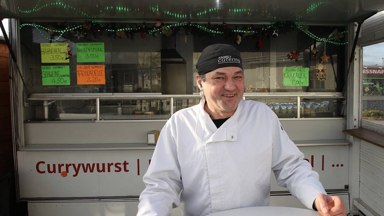 Jan Rachwalski vor seiner Imbiss-Bude auf dem Parkplatz an der Gaußstraße. | © Peter Steinert