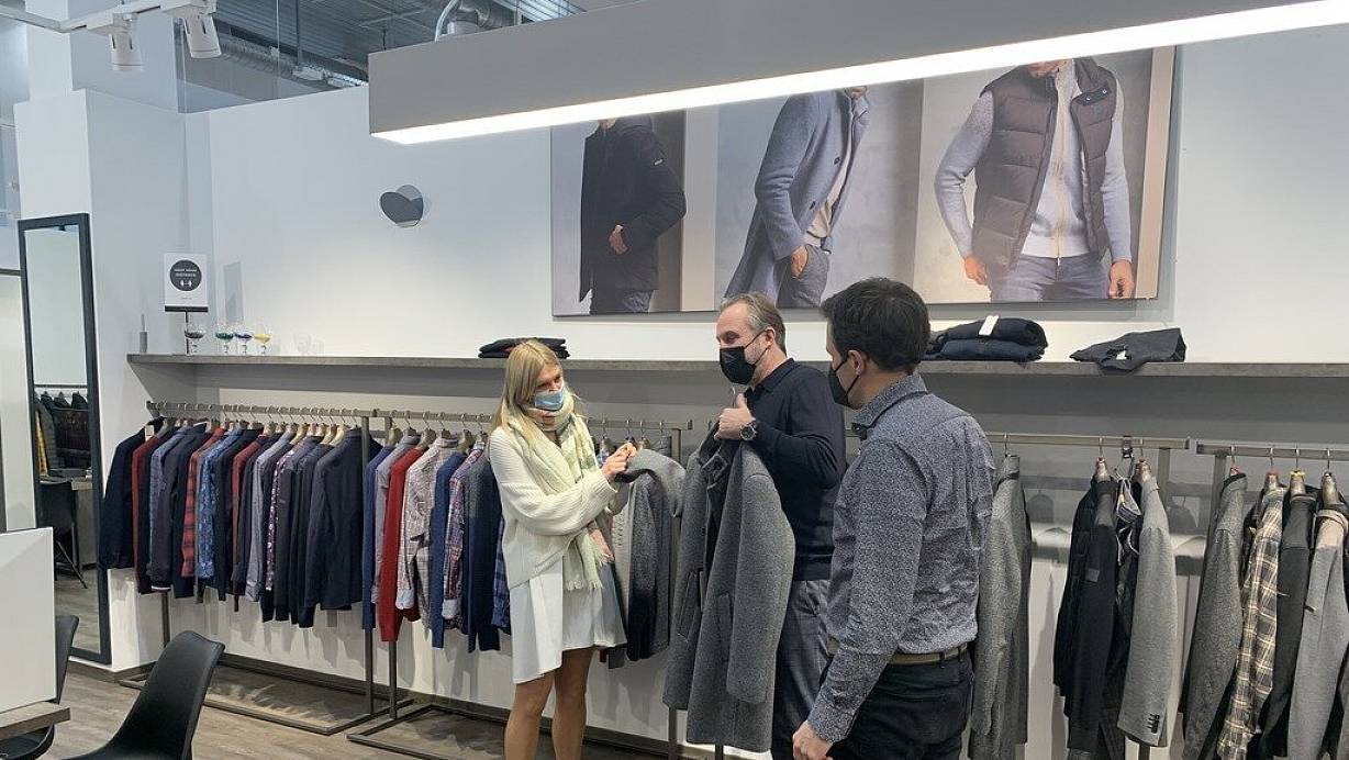 Thomas Bergs, Vertriebsleiter Deutschland bei Bugatti (Mitte) zeigt den Einkäufern auf der Messe in Düsseldorf die neueste Kollektion. Die Kunden freuen sich, die Mode wieder persönlich in Augenschein nehmen zu können. | © Bugatti